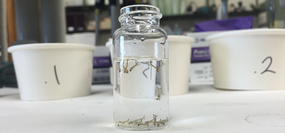 The Yellow fever mosquito (Aedes aegypti) and the Asian tiger mosquito (Aedes albopictus) are important nuisance mosquitoes and vectors of disease causing pathogens. These species of mosquitoes lay eggs in backyard containers close to where people live. They do not fly far from their larval habitats to search for a blood meal. In addition, these mosquitoes will bite at all times of the day, including daylight hours. Our laboratory is heavily involved in research on these species. In particular, we are interested in factors contributing to development rates, the effectiveness of larvicides on these species at different temperatures, nectar feeding in the adults, and effective trapping strategies.